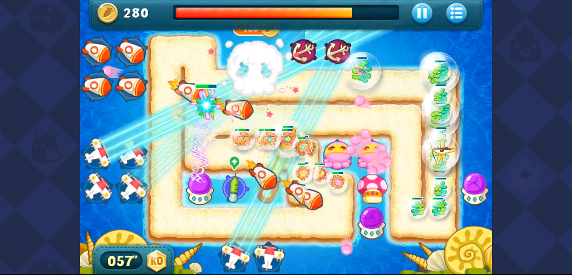 额外任务的完成往往决定是否能获得水晶萝卜。使用手电筒消灭20个怪物需要优先升级它并集中攻击路径。确保在30秒内清除地图右侧的彩虹,这通常通过初始炸弹就能实现。保持魔法球数量在限制内,避免浪费资源,从而专注于关键防御点的强化。